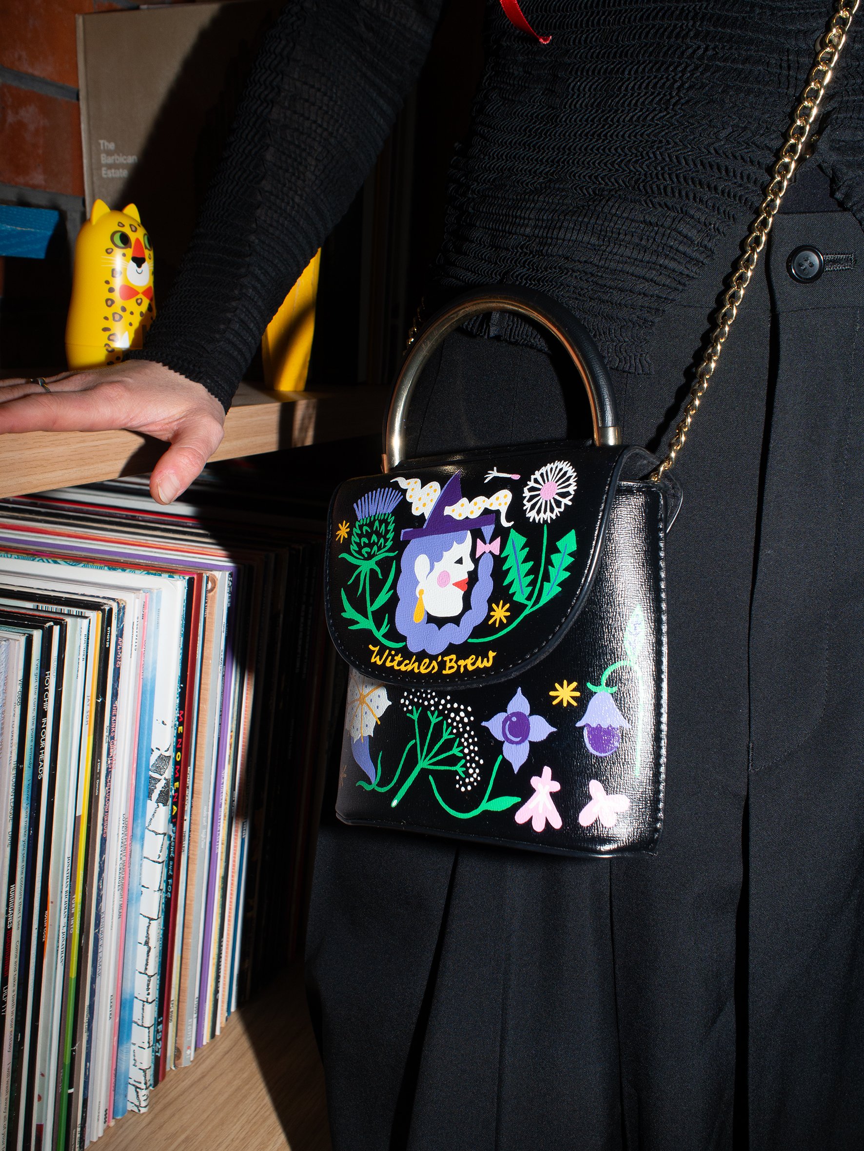 One of a kind hand painted vinyl cross body bag featuring all the herbs you need to make the perfect Witch's Brew tea.
